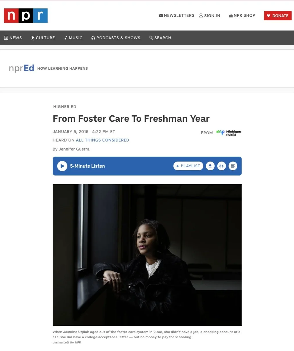 By the time she aged out of foster care, Jasmine Uqdah had spent nearly half her life in the system. On a summer day in 2008, Uqdah grabbed her duffel bag and two small garbage bags, and she stuffed everything she owned inside.