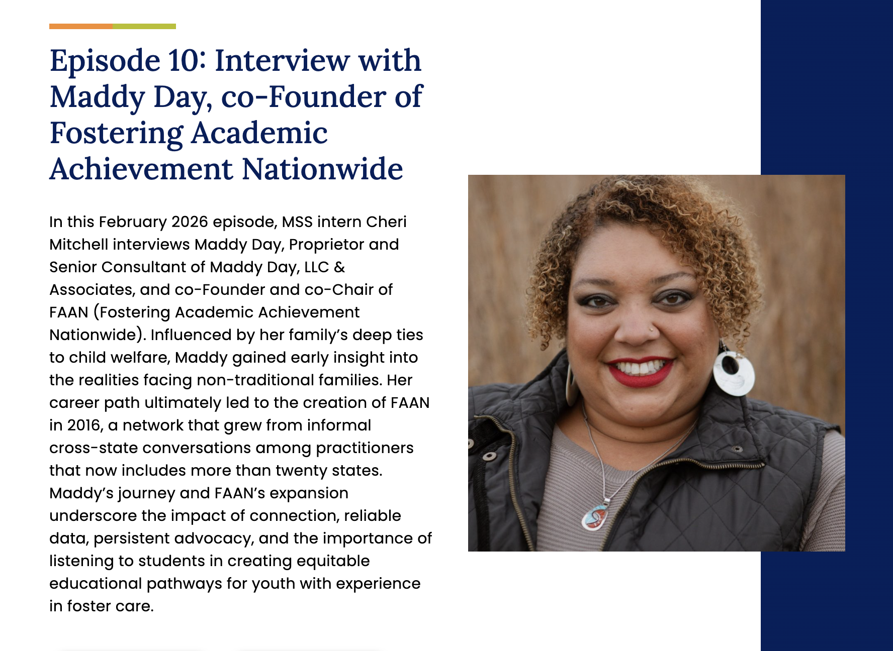 Influenced by her family’s deep ties to child welfare, Maddy gained early insight into the realities facing non‑traditional families. Her career path ultimately led to the creation of FAAN in 2016, a network that grew from informal cross‑state conversations among practitioners that now includes more than twenty states. Maddy’s journey and FAAN’s expansion underscore the impact of connection, reliable data, persistent advocacy, and the importance of listening to students in creating equitable educational pathways for youth with experience in foster care.